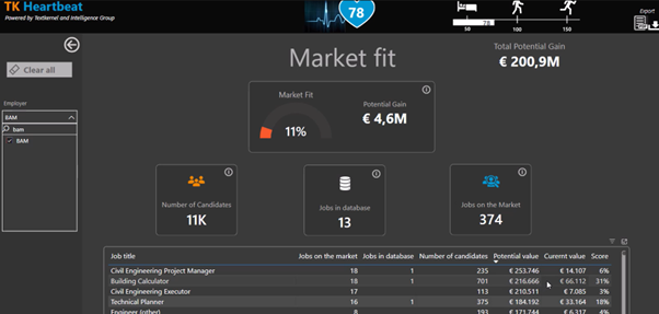 Dit principe geldt voor iedere eigen medewerker, maar ook voor iedere kandidaat die aan de deur klopt. Van elke kandidaat wil je een indicatie hebben van diens bemiddelbaarheid in algemene zin, maar in het bijzonder ten opzichte van de de eigen klantengroep. Zo zie je direct de potentiële waarde, zoals in onderstaand voorbeeld. Waarin 235 relevante profielen in de database, tegen 18 vacatures gematcht kunnen worden bij de klant BAM in plaats van 1 die nu in portefeuille is. In plaats van een potentiële opbrengst van 14.000 ligt er een potentiële opbrengst van 254.000 euro. En dat is slechts: 1 profiel, bij 1 klant….