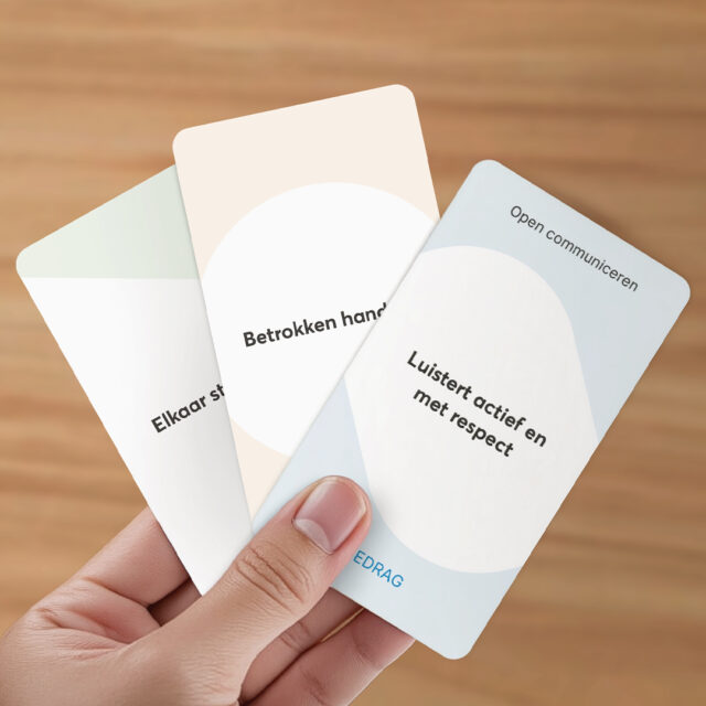 Geformuleerde kernwaarden, of ‘werkwaarden’, zoals ze het hier noemen, blijven vaak ‘wat abstract’, aldus Aspers. ‘Ze hebben voor iedereen ook vaak een andere betekenis. We hopen dat het met een kaart in je hand makkelijker wordt om het gesprek erover te voeren.’ Strikte spelregels zijn er bij het kaartspel niet, legt ze uit. ‘Je kunt ze bijvoorbeeld op volgorde leggen van wat voor jou belangrijk is. Het is niet de bedoeling dat je een uur lang een spel ermee gaat spelen. Het is vooral bedoeld om te helpen vragen aan te scherpen.’