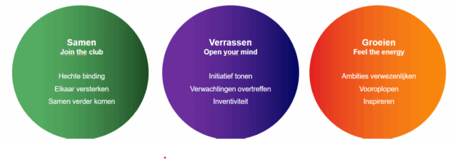 Er zijn ‘gedragskaarten en impactkaarten’, legt Aspers uit. ‘Dat helpt als je net in dienst bent om het gesprek over te voeren. Je kunt het ook in het werving- en selectieproces al spelen, omdat het helpt te zoeken: heeft iemand het DNA waar we naar op zoek zijn? Daarnaast kun je er op teamniveau mee aan de gang, om teamdoelen te bespreken. En ook met collega’s: waar zit mijn groei nog in, om zo goed mogelijk bij die waarden te passen?’