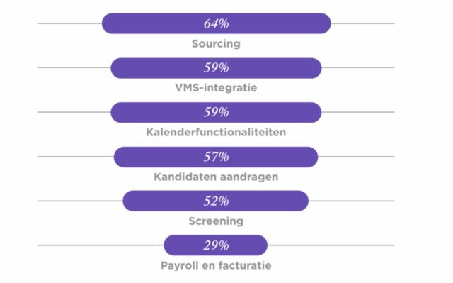En wat staat er dan zoal op dat digitale verlanglijstje? Dat blijkt vooral sourcing te zijn, gevolgd door integratie met vendor management systemen, en mogelijkheden om bijvoorbeeld kandidaten zelf afspraken te laten maken. Ook referralsystemen en screening zijn processen waar recruitmentbureaus blijkbaar veel potentie voor automatisering zien.