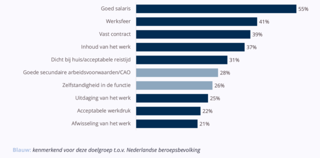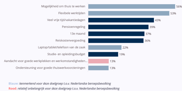 En daarbij spelen bij hen vooral de mogelijkheid om thuis te werken en flexibele werktijden een doorslaggevende rol. Aandacht voor goede werkplekken en goede werkomstandigheden? Dat speelt voor deze doelgroep dan juist weer minder een rol, zo blijkt. Waarschijnlijk gaan ambtenaren ervan uit dat dit bij deze overheidswerkgevers wel goed geregeld zal zijn.