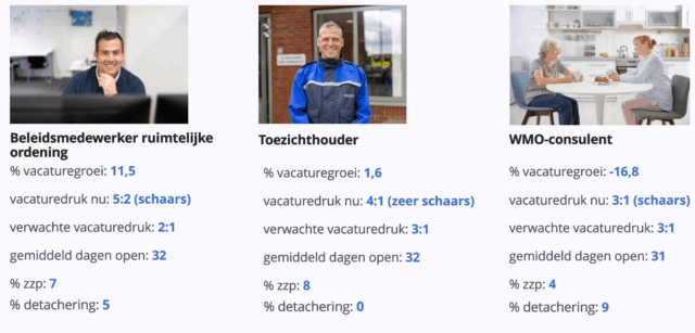 Die laatste groep, de WMO-consulent, is overigens wel steeds minder in trek, blijkt uit de cijfers. Waar de beleidsmedewerker afgelopen jaar nog een vacaturegroei liet zien van ruim 11%, is het aantal open vacatures voor WMO-consulenten in die tijd juist met bijna 17% afgenomen. Wel geldt de WMO-consulent nog altijd als schaars, met zo’n 3 vacatures voor elke actief werkzoekende in deze sector. En dat lijkt voorlopig ook niet te veranderen.