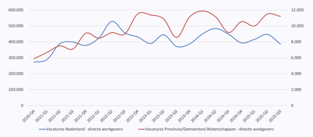 De spanning op de arbeidsmarkt mag dan misschien wat afnemen, ‘de personele uitdaging blijft’, zo concludeert het A&O Fonds van de Nederlandse gemeenten. In hun meest recente Vacaturemonitor, over de eerste helft van 2025, noteren ze maar liefst 37% mínder vacatures dan in dezelfde periode in 2024. Een ‘kantelpunt’, zo noemen ze het zelf. Maar tegelijk is de krapte niet verdwenen: vanaf mei en juni werden juist weer meer vacatures uitgezet. En ook voor het komende jaar zijn de vacatureverwachtingen van de gemeenten weer positief, net als bijvoorbeeld bij de provincies en waterschappen het geval is.