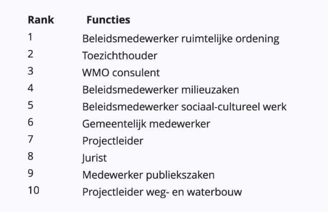 De 3 meest gewilde functies bij de lagere overheden zijn de beleidsmedewerker ruimtelijke ordening, de toezichthouder en de WMO-consulent.