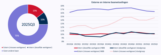 Daarmee samenhangend is het opvallend te noemen dat ook bij ambtenaren van gemeenten en provincies te zien is dat ze vaker dan voorheen overstappen naar een nieuwe werkgever. Nog steeds gebeurt dit minder dan in de rest van de arbeidsmarkt – eenmaal binnen bij een lagere overheid, blijf je daar wel vaak relatief lang werken -, maar het verschil wordt wel aanmerkelijk snel kleiner, ook omdat in de rest van de arbeidsmarkt het aantal mensen dat extern een nieuwe baan vindt de laatste tijd juist wat afneemt.