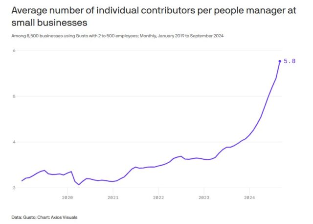 Uit een analyse van Live Data Technologies bleek dat middenmanagers 32% van alle ontslagen in 2023 voor hun rekening namen, vergeleken met 20% in 2019, een stijging van 60% in het aandeel van management in de personeelsreducties. Daarnaast meldde onderzoek van Gusto onder 8.500 kleine en middelgrote bedrijven dat de span of control van leidinggevenden in diezelfde tijd verdubbeld is, van 3 directe ondergeschikten in 2019 naar 6 directe ondergeschikten in 2025.