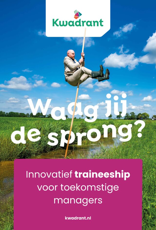 Het fierljeppen is een iconische sport in Fryslân. Het heeft visueel en tekstueel mooie haakjes voor onze campagne: Durf jij de sprong te wagen? We gebruikten een man en vrouw als model die door kunnen gaan als manager bij Kwadrant. Voor extra opvalwaarde droegen zij een pak met laarzen eronder. Als Call to action roepen we op om naar het event (Spring in het diepe dag) te komen. Men hoefde zich alleen maar aan te melden. Beeld en tekst stralen lef uit, dit zoeken we ook bij de doelgroep. Kwadrant is een innovatieve organisatie, dat laten we met dit concept en de campagne ook zien.