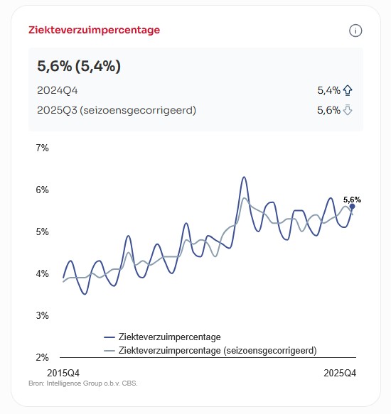 Het ziekteverzuim staat momenteel niet op recordniveau. Dat werd in de tijd van corona aangetikt. Maar het is al wel anderhalf jaar geleden dat het verzuimpercentage voor het laatst onder de 5% lag. En dat is een niveau dat in de jaren vóór 2021 zelfs maar 1 keer werd gehaald. Het ziekteverzuim lijkt met andere woorden een ‘nieuw normaal’ te hebben gevonden boven de 5%. Dat komt erop neer dat er structureel zo’n 500.000 personen ziek op de bank zitten. Waarbij ongeveer 25% van al het verzuim wordt veroorzaakt door langdurige stressgerelateerde klachten. Psychisch verzuim dus.