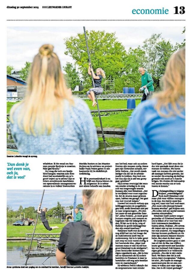 Het inzicht dat we in krappe markt extra moesten opvallen was de basis. De aanpak was in alles onderscheidend en passend bij de kernwaarden ‘kracht door verbinding’ en werkplezier. De campagne ‘Durf jij de sprong te wagen’ was in alles gedurfd. Als Friese organisatie hebben we gekozen voor de symboliek van Fierljeppen. Alle traffic van de campagne hebben we toe geleid naar een kennismakingsdag op de fierljepbaan, waar ook daadwerkelijk lef getoond werd en een fierljepsprong gemaakt kon worden. Het hele traject was vooraf strak gepland: van werving, tot assessment, tot aanname, tot start.
