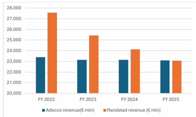 En het vervelende voor het bedrijf uit Diemen: het verschil lijkt alleen maar groter te worden. Waar Randstad twee weken geleden nog een krimp van de omzet van 4% bekend maken, het twaalfde kwartaalverlies op rij, meldde Adecco deze week juist een mooie plus van 4% in de omzet over het laatste kwartaal van 2025, nadat in de kwartalen ervoor ook al weer een omzetgroei was ingezet. Ook die andere Randstad-concurrent, Manpower, lijkt inmiddels weer aardig de wind in de zeilen te hebben. Het bedrijf kende in 2025 zelfs de beste omzetontwikkeling sinds 2021, toen de mondiale omzet met een groei van 15% uit de coronacrisis oprees.