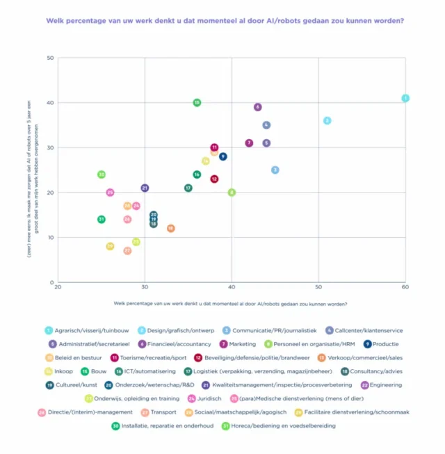 De hoogste impact wordt verwacht in land- en tuinbouw (60% van het werk wordt hier als automatiseerbaar gezien), gevolgd door design (51%), communicatie & PR (45%), callcenters (44%) en administratieve functies (44%). Aan de andere kant zien horecamedewerkers, technische medewerkers in installatie en reparatie, facilitaire diensten en sociaal-maatschappelijke beroepen de laagste impact, rond de 25 à 26%.
