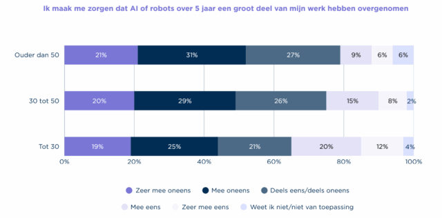 Jongeren voelen de impact van A.I. naar eigen zeggen het sterkst. Belgen jonger dan 30 jaar schatten dat gemiddeld 45% van hun werk nu al door A.I. of robots kan worden overgenomen, tegenover 35% in de totale beroepsbevolking. Zij maken zich ook het vaakst zorgen over de toekomst van hun werk: 32% van de 30-minners vreest dat A.I. binnen 5 jaar een groot deel van zijn of haar job zal hebben overgenomen, tegenover 23% bij 30- tot 50-jarigen en slechts 15% bij 50-plussers.