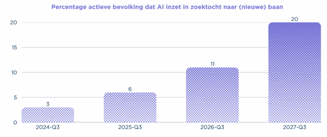 A.I. heeft overigens niet alleen impact op het werk zelf, maar ook de manier waarop mensen naar een baan zoeken. Bij de Belgen zal A.I. naar verwachting al in 2027 1 van de 10 meest gebruikte oriëntatiebronnen zijn, aldus het onderzoek.