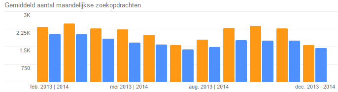 Al jaren is er sprake van een dreigend tekort aan gekwalificeerd technisch personeel. Het zoekgedrag in Google bevestigt dit beeld. Het gemiddelde aantal zoekopdrachten naar technische vacatures lag in 2014 elke maand lager in vergelijking met 2013 (zie afbeelding). Daarentegen is de concurrentie op dit soort zoekwoorden erg hoog, te zien aan de hoeveelheid advertenties op een gemiddelde SERP (Search Engine Result Page) bij een zoekterm als ‘vacature techniek’. Aanbieders van technische functies hebben het dan ook moeilijk om de juiste doelgroep te bereiken en kwalitatieve sollicitaties binnen te halen.