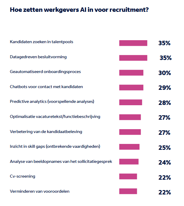 Opvallend is dat onder de werkgevers die A.I. al wel toepassen, de tevredenheid enorm is: 87% zegt het effectief te vinden, en slechts 1% ziet het nut er niet van in. Toch wordt A.I. slechts beperkt gebruikt, bijvoorbeeld voor het zoeken van kandidaten in talentpools (35%) en datagedreven besluitvorming (35%). De cv-beoordeling is nog nauwelijks geautomatiseerd (22%). Volgens Indeed wijst het onderzoek op een groeiende mismatch: ‘werkzoekenden gebruiken A.I. om sneller, beter en gerichter te solliciteren, maar werkgevers laten kansen liggen door onvoldoende gebruik te maken van beschikbare A.I.-tooling.’