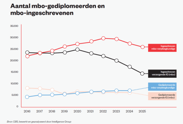 Wordt het in de nabije toekomst makkelijker om deze schaarse zorgmedewerkers te vinden? Daar heeft het voorlopig niet de schijn van. Zo blijkt het aantal ingeschreven studenten bij de mbo-opleiding verpleegkunde verder te dalen naar ongeveer 25.000, maar nog alarmerender is de instroom in de opleidingen voor verzorgende IG, zo meldt het rapport. Deze is namelijk met maar liefst zo’n 40% gedaald ten opzichte van de piek in 2020, en ligt nu op circa 14.300 inschrijvingen. Daarmee is het onvermijdelijk dat het aantal mbo-gediplomeerden af zal nemen de komende jaren, waarvan het begin nu al is waar te nemen.