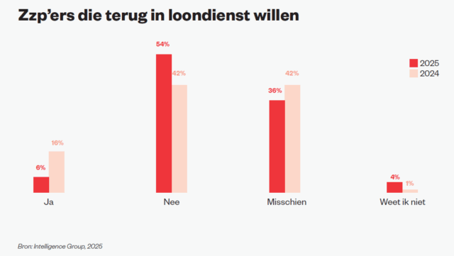 Als gevolg van de handhaving op schijnzelfstandigheid hebben veel zzp’ers in de zorg inmiddels de overstap naar loondienst al gemaakt. Het is dan ook nauwelijks een verrassing te noemen dat de resterende zzp’ers zo’n vast dienstverband juist minder zien zitten. Slechts 6% zegt nu nog bereid te zijn over te schakelen, vergeleken met 16% vorig jaar, en het percentage ‘nee’ is gestegen van 42% in 2024 naar nu 54%. Al zit er mogelijk nog wel enige ruimte om de 40% ‘misschien’ en ‘weet ik niet’ te verleiden tot een overstap naar vaste dienst.